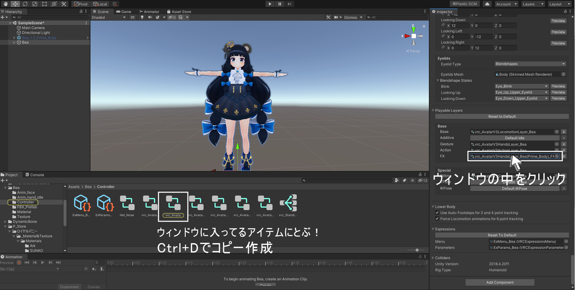 着せ替えアニメーションを設定する際に必要になる部分が【FX】と【VRCExpressionsMenu】と【VRCexpressionParameter】です。中身をいじっていくので万が一の事故に備えて複製をします。