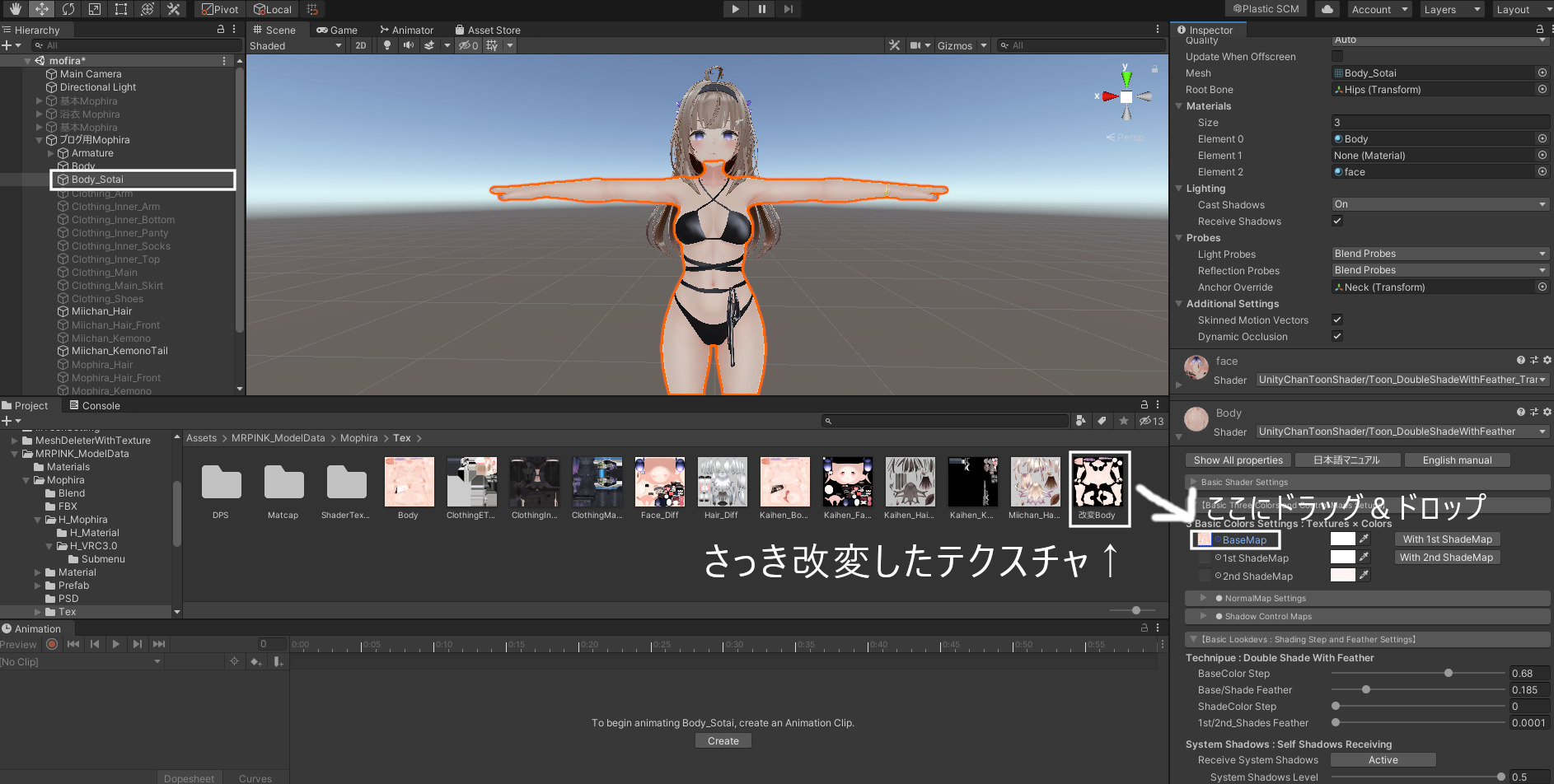 インスペクターでBodyのマテリアルを▼を押して中身を展開し、テクスチャが入っているウィンドウにさっき改変したテクスチャをドラック&ドロップ!